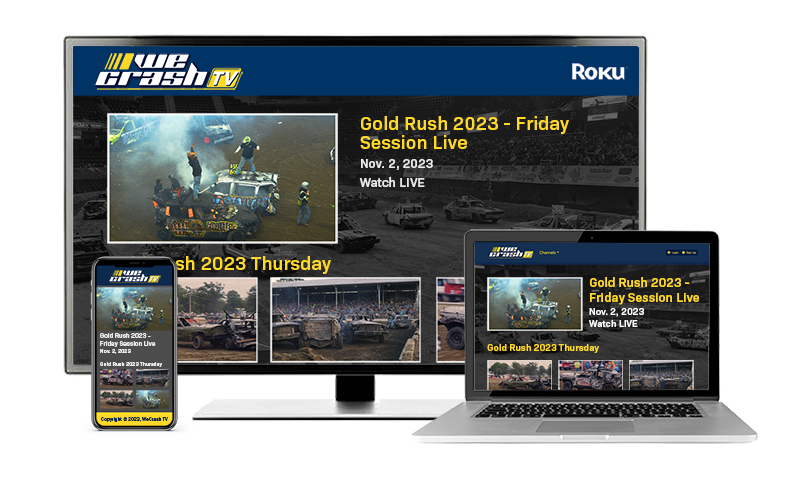 WeCrash TV brings you broadcast quality coverage of the biggest events in demolition derby to your phone, tablet, computer or TV. Here's how easy it is to get to the action!